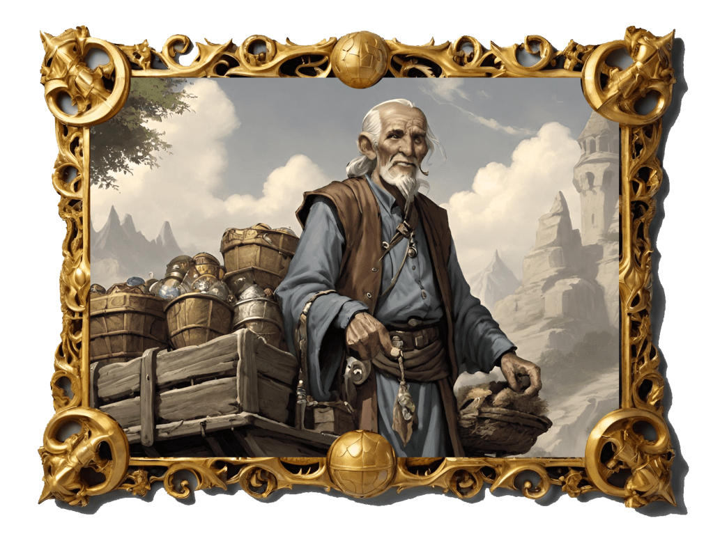 At the heart of this jubilant affair lay the legend of Old Carvas, a venerable peddler whose name danced through the ages like a flame flickering in the wind. It was whispered that he was the harbinger of the first caravan to grace Waterdeep’s gates, a jovial soul who traversed the realm, with a wagon overflowing with wonders, destined for the eager hands of Waterdhavian youth.