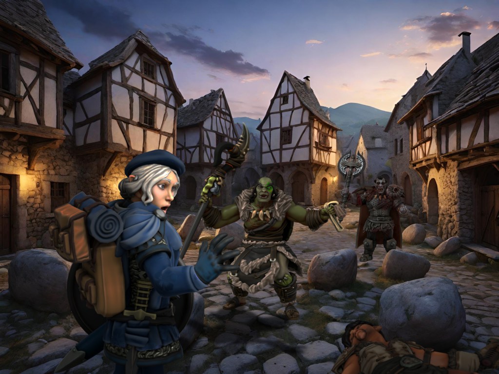 Soon, the orcs, led by Gurrash, their haggard chieftain, and Norgra One-Eye, their haggish shamaness, breached the southern wall. While Privates Breck and Winterspell ran to defend the keep, our heroes raced to meet the invaders in the town square, hearts aflame with the fire of righteous indignation. Javelins and arrows flew through the air as both parties advanced towards each other, locked in a deadly dance of death and destruction. The clash of steel rang out as the two forces collided in the stony square, a swirling maelstrom of chaos and carnage unfolding amidst the cries of the wounded and the dying. In the heart of the fray, Tien was struck down by a powerful blow from an orcish assailant, his form crumpling to the ground amidst the tumultuous tide of battle. Meanwhile, Lady Syndra found herself ensnared in the sinister machinations of Norgra One-Eye, her longsword slipping from her grasp as a malevolent hex took hold of her very being. With a triumphant roar, Gurrash urged his warriors onward, his eyes ablaze with savage fury as he sought to crush the defenders of Nightstone beneath his bloody boot heel.