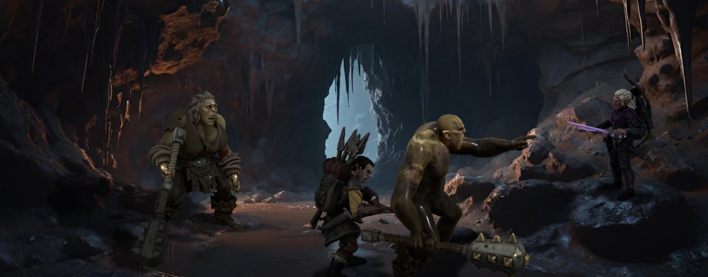 Our heroes hastily patched up their wounds as they took their morning repast, then headed north, at the direction of the surviving Nightstone guards, to the so-called “Dripping Caves”, presumed refuge of Nightstone’s villagers. Dear readers, sure enough, the tracks of the fleeing villagers were easy to follow, and led our intrepid heroes directly to the nearby caverns. Amidst the oppressive gloom of the cavern’s depths, our valiant band pressed onward, undaunted by the dank stench that hung heavy in the air. With Tien’s torch casting flickering shadows upon the rugged walls, they ventured forth into the heart of darkness, their senses keenly attuned to the slightest hint of danger that lurked within.