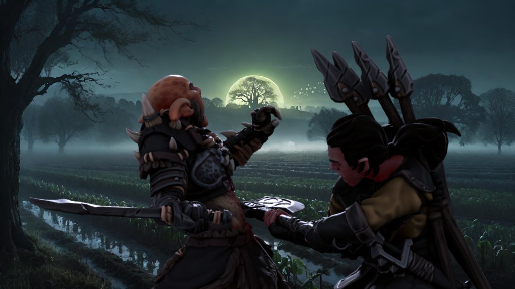 Tien’s arrow flew true, piercing a goblin’s heart, while Zephyr and Dru charged ahead, undeterred by goblin scimitars. Lifferlas, the awakened tree, crushed a bugbear beneath his mighty branches as Murk, with ferocious intensity, leaped at another. Eridan’s arrow struck an ogre, and Syndra joined Murk in the fray. Naxene’s spells felled a bugbear and a goblin, though Zi fell to an ogre’s blow. Shalvus wounded another bugbear before Tien crossed the stream and struck true against an ogre. Dru’s blade cleaved through another goblin, while Oren quaffed a healing potion to boost his waning strength. Lifferlas smashed an ogre with the weight of centuries, and Miros bullseyed a goblin. Oren was cruelly struck down by a bugbear, but Eridan, Naxene, Syndra, and Shalvus fought with unwavering resolve. Tien, Zephyr, and Dru dispatched more goblins, shattering their morale, while Lifferlas and Murk finished off the last bugbears in a flurry of boughs and blades.